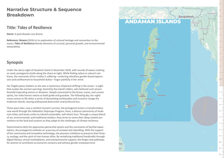 The ongoing research project explores the luxury cruise industry’s impact on marginalised communities, focusing on issues such as pollution, overtourism, and economic dependency. It culminates in a speculative spatial film that envisions a resilient future for the Andaman Islands in the wake of a climate catastrophe. The narrative follows a tsunami survivor who lost everything—including her home, land, and personal identity—and who embarks on a journey marked by memories of gender oppression and the wisdom of indigenous traditions. Her story intertwines with a community effort to rebuild sustainable lives through the Habitation Shipscape Program.